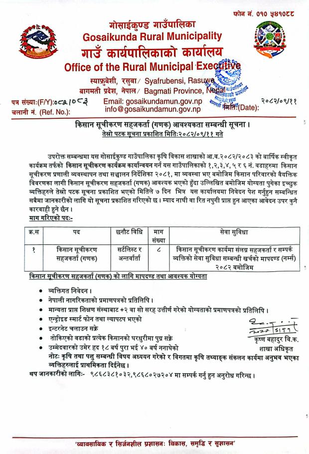 किसान सूचीकरण सहजकर्ता (गणक) आवश्यकता सम्बन्धि सूचना (तेश्रो पटक प्रकाशित)