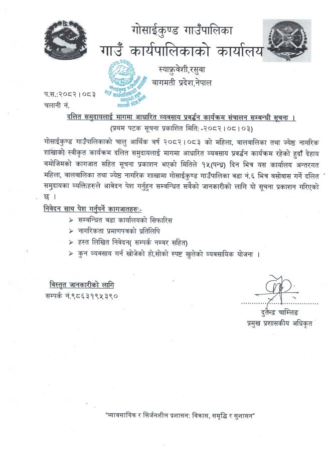 दलित समुदायलाई मागमा आधारित व्यवसाय प्रवर्दन कार्यक्रम संचालन सम्बन्धी सूचना