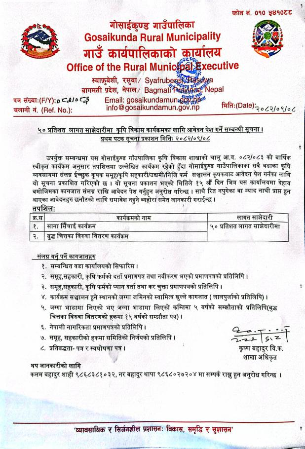५० % लागत साझेदारीमा कृषि विकास कार्यक्रमका लागि आवेदन पेश गर्ने सम्बन्धी सूचना
