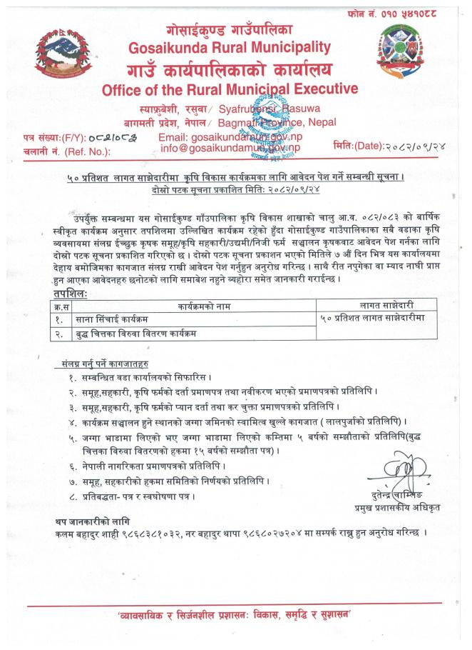 ५० % लागत साझेदारीमा कृषि विकास कार्यक्रमका लागि आवेद पेश गर्ने सम्बन्धी सूचना(दोश्रो पटक प्रकाशित)