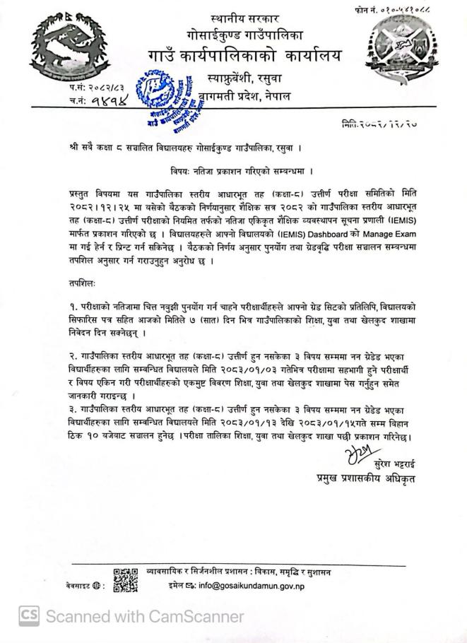 नतिजा प्रकाशन गरिएको सम्बन्धि सुचना।