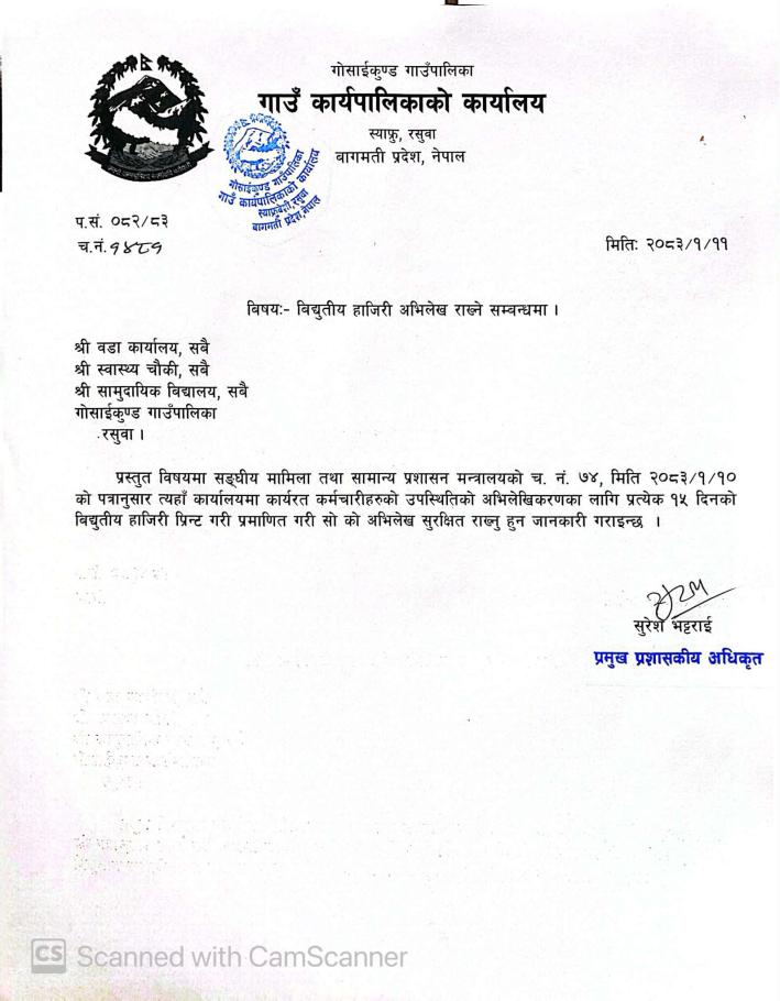 बिद्युतीय हाजिरी अभिलेख राख्ने सम्बन्धमा ।