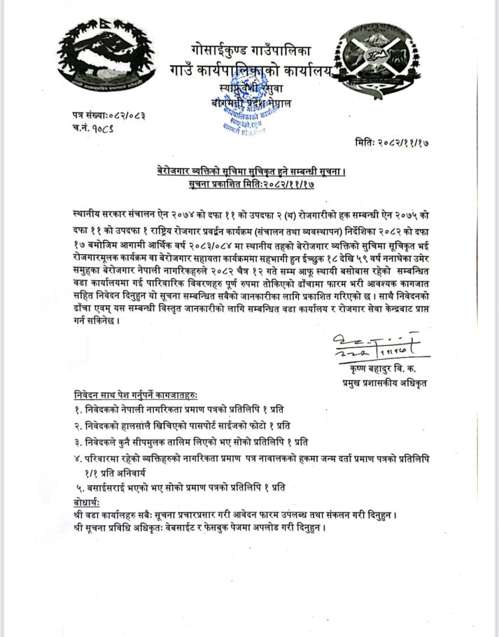 बेरोजगार व्यक्तिको सूचीमा सुचीकृत हुने सम्बन्धी सूचना ।