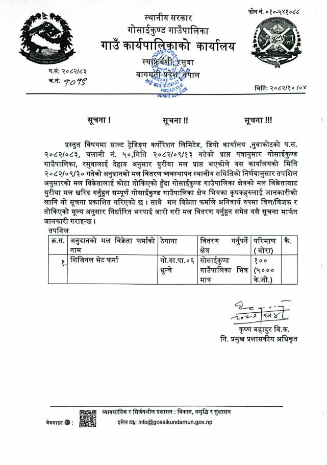 मल वितरण सम्बन्धी सूचना