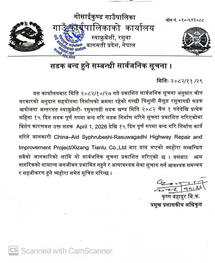 सडक बन्द हुने सम्बन्धी सार्वजनिक सूचना ।